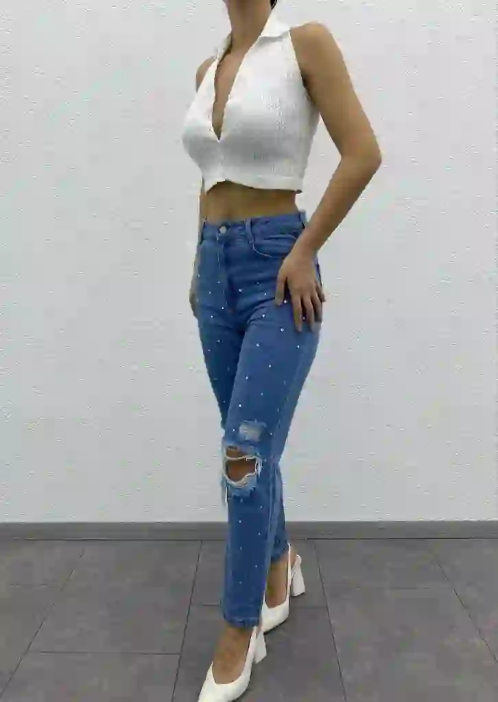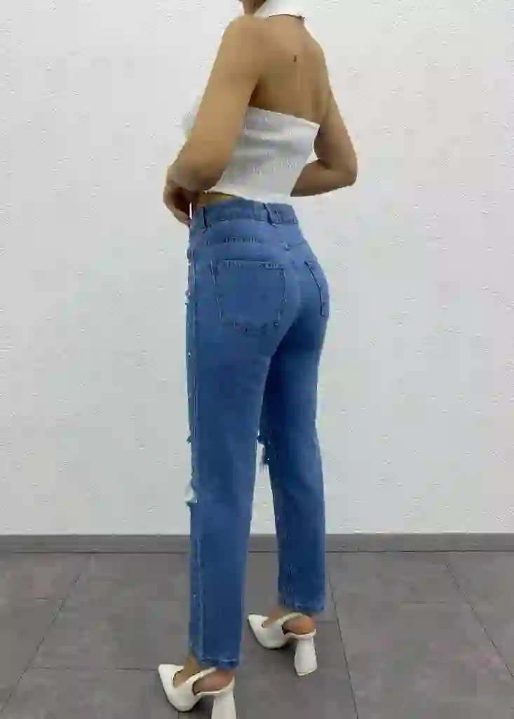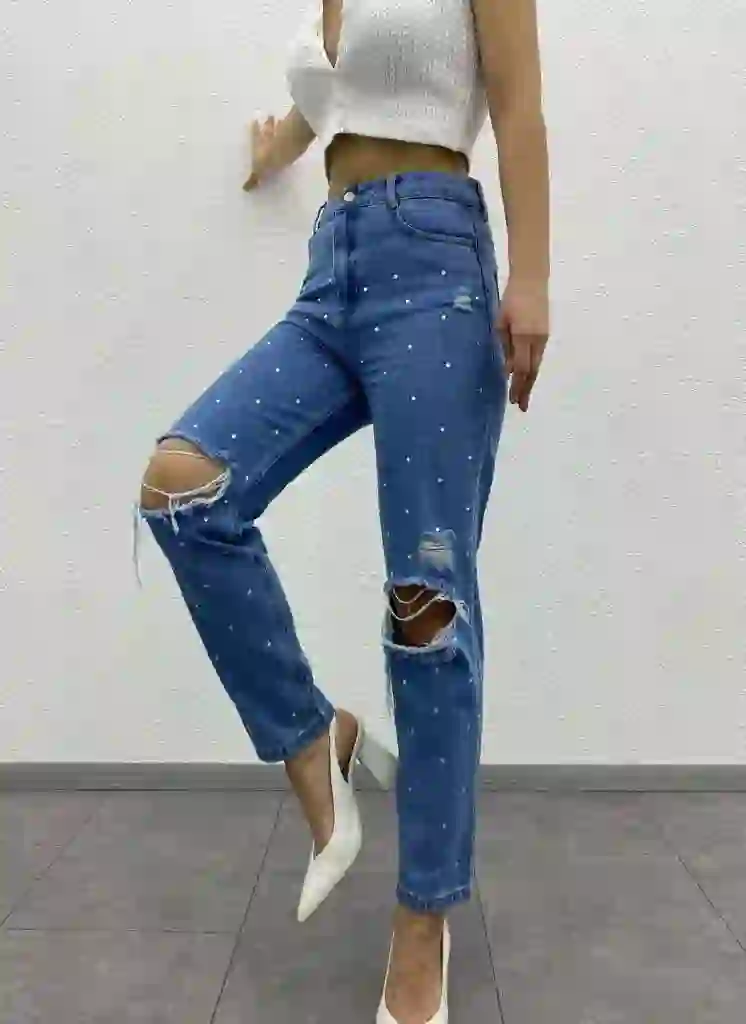 Mom Fit Τζιν Παντελονι Με Σκισιματα Και Στρας