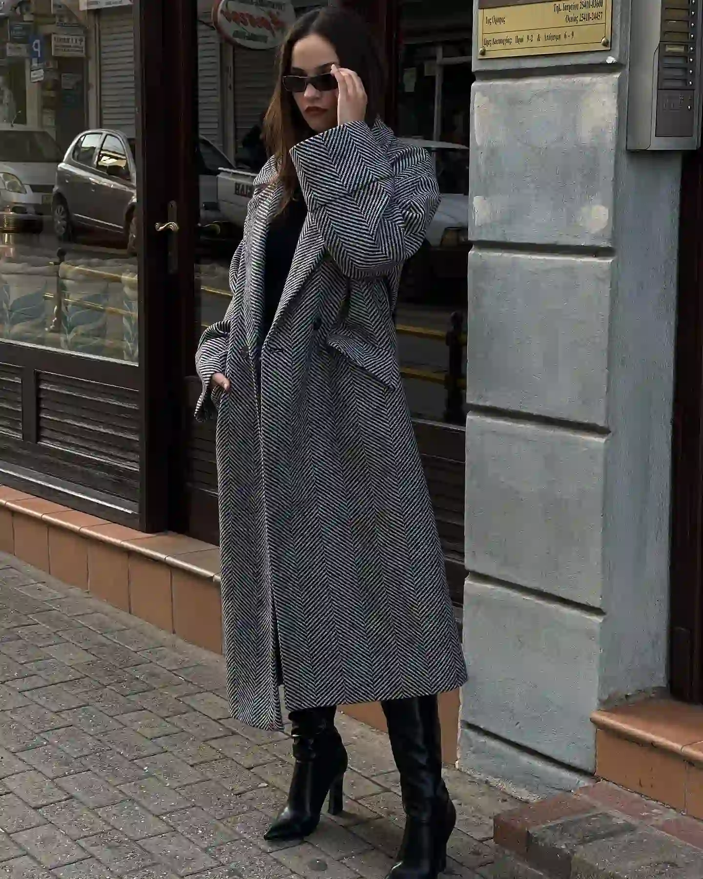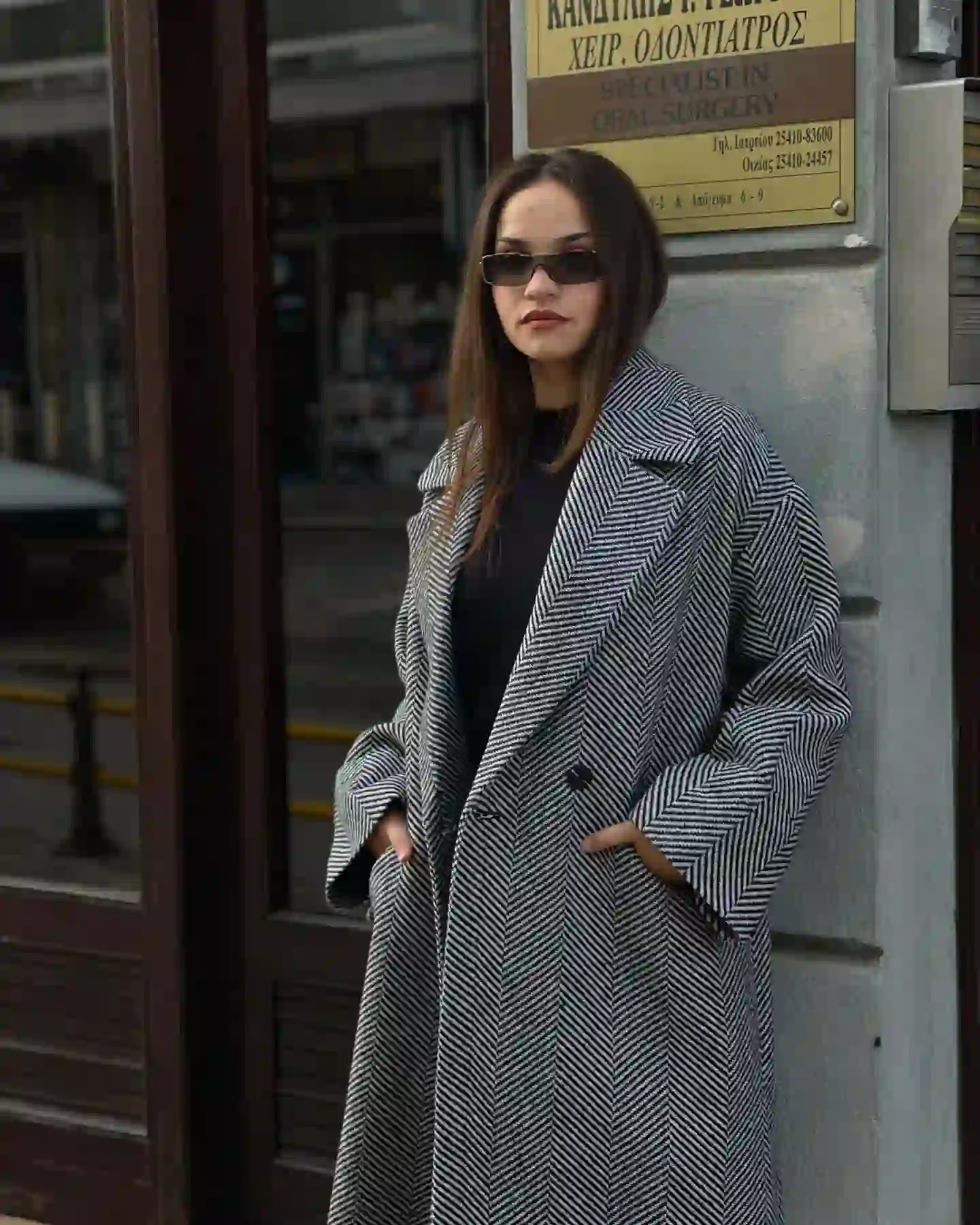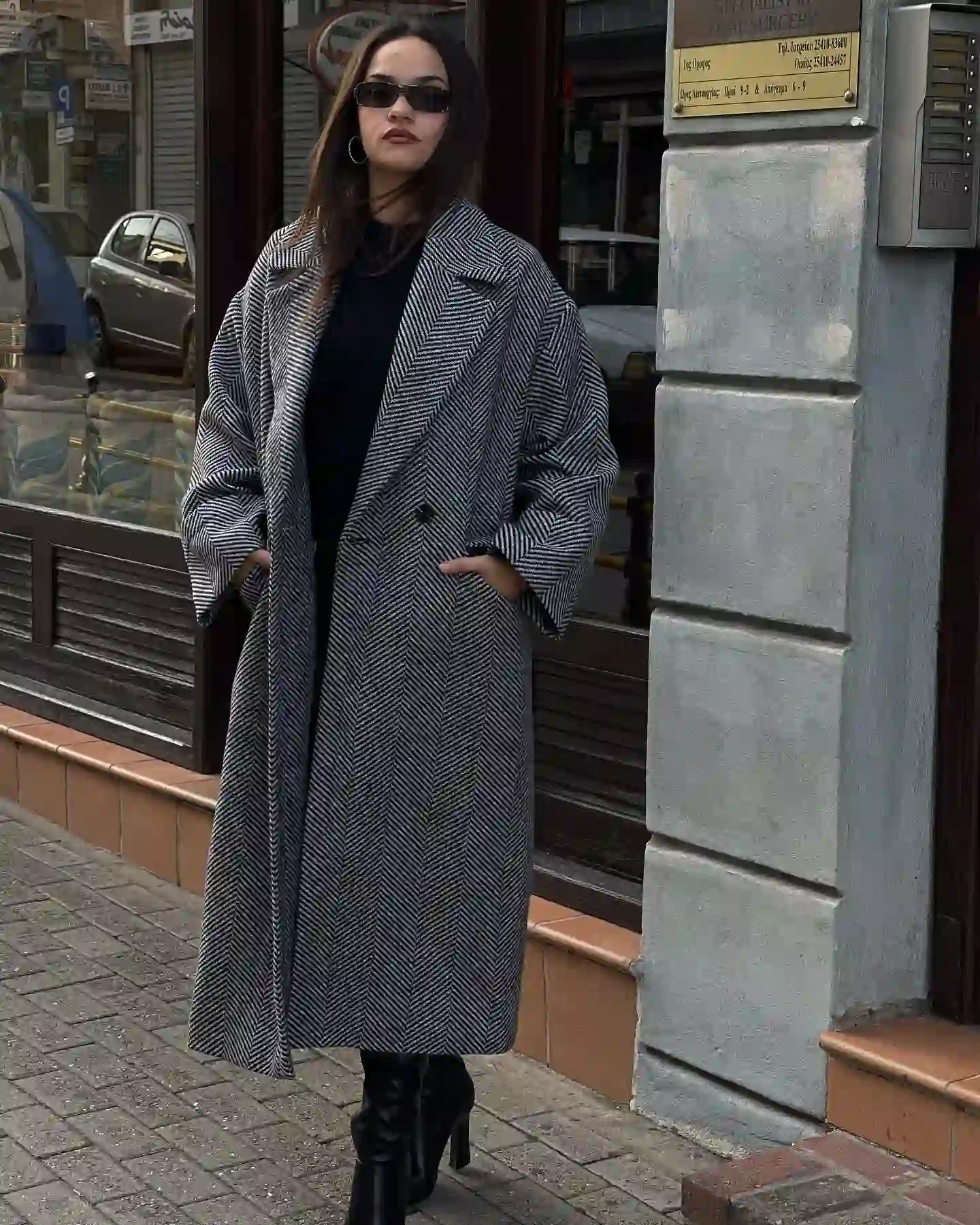 Ολόμαλλο Oversize Παλτό Ψαροκόκαλο/Γκρι